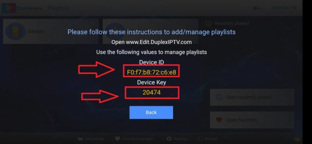 Step 4= Type “Device ID” and “Device Key” here. Then click “I am not a robot” click and manage playlists click