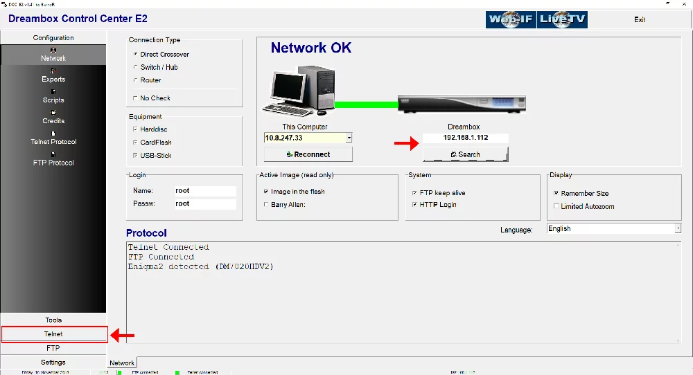 Start by downloading the necessary items. DCC_E2 (Dreambox Control Center for Enigma2). You must connect to your Enigma box using Dreambox Control Center E2 and click on “Telenet“. But first, you must find the IP address of your enigma2 box. We will discuss this further ahead in this article.