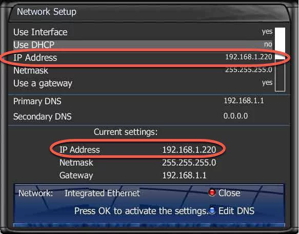 To connect, we need to know the box IP address, username, and password (username and password usually is root/root). Now about the IP, click Menu button on the remote controller. Go to Setting then Network Settings. You should see something like the below image: