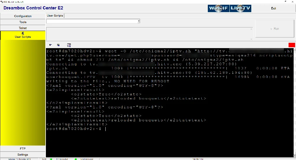 wget -O /etc/enigma2/iptv.sh “http://tv.yourdns.com/get.php?username=your-line-username&password=your-line-password&type=enigma216_script&output=ts” && chmod 777 /etc/enigma2/iptv.sh && /etc/enigma2/iptv.sh