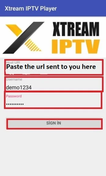 XTREAM IPTV PLAYER Step 1= Download the app and open it Step 2= As shown in the picture below In the information sent to you; Type the URL, username and password